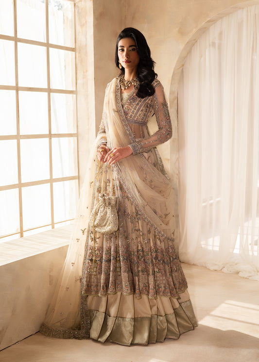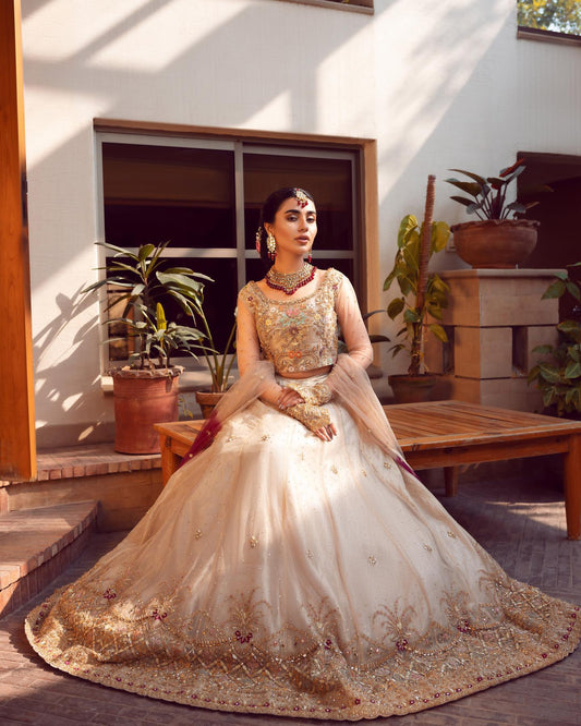 Design Name: Orchid Color: Beige with hints of Coral and Gold Features:Choli- Pure NetLehnga- Pure...
