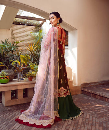 Design Name: Bahar-e-Gul Color: Burnt Orange Features: Choli-Pishwas-Dupatta- Product details: A refreshingly vibrant orange-hued pishwas that...