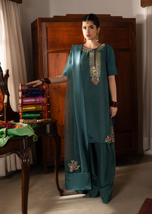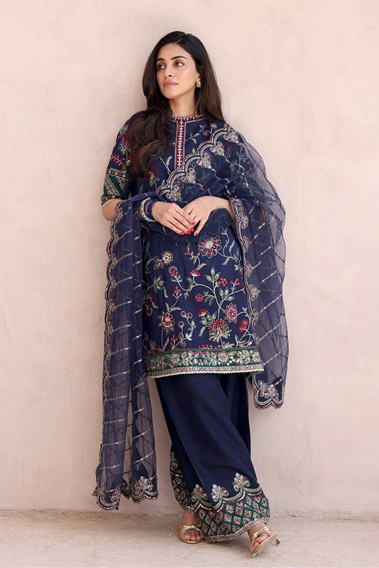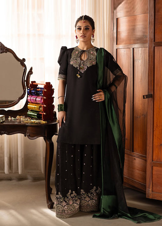Design Name: Midnight Color: Coal Black Features:Pishwas- Premium silkSharara- Korean RawsilkDupatta- Pure Chiffon with Muqaish...