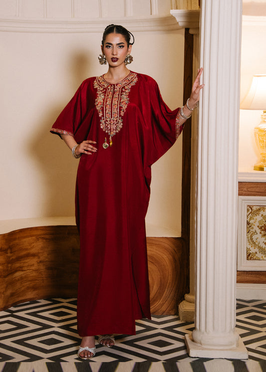 Product Description:Introducing Belle, a majestic kaftan drenched in royal red, radiating regality and sophistication. Crafted...