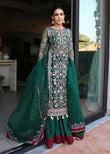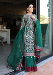 Wrapped in the richness of royal green and touched with a bold maroon contrast, Naghma is a vision of grace and grandeur. This exquisite piece from the Naznin Festive Collection '25 embodies the finest craftsmanship, featuring hand-embellished sleeves, intricate embroidery, and delicate handwork that adorns its flowing silhouette. Designed on a luxurious organza canvas, this unstitched ensemble comes with a beautifully bordered dupatta and matching trousers, offering a timeless look for the most enchanting celebrations. Let Naghma be your statement of sophistication this festive season.