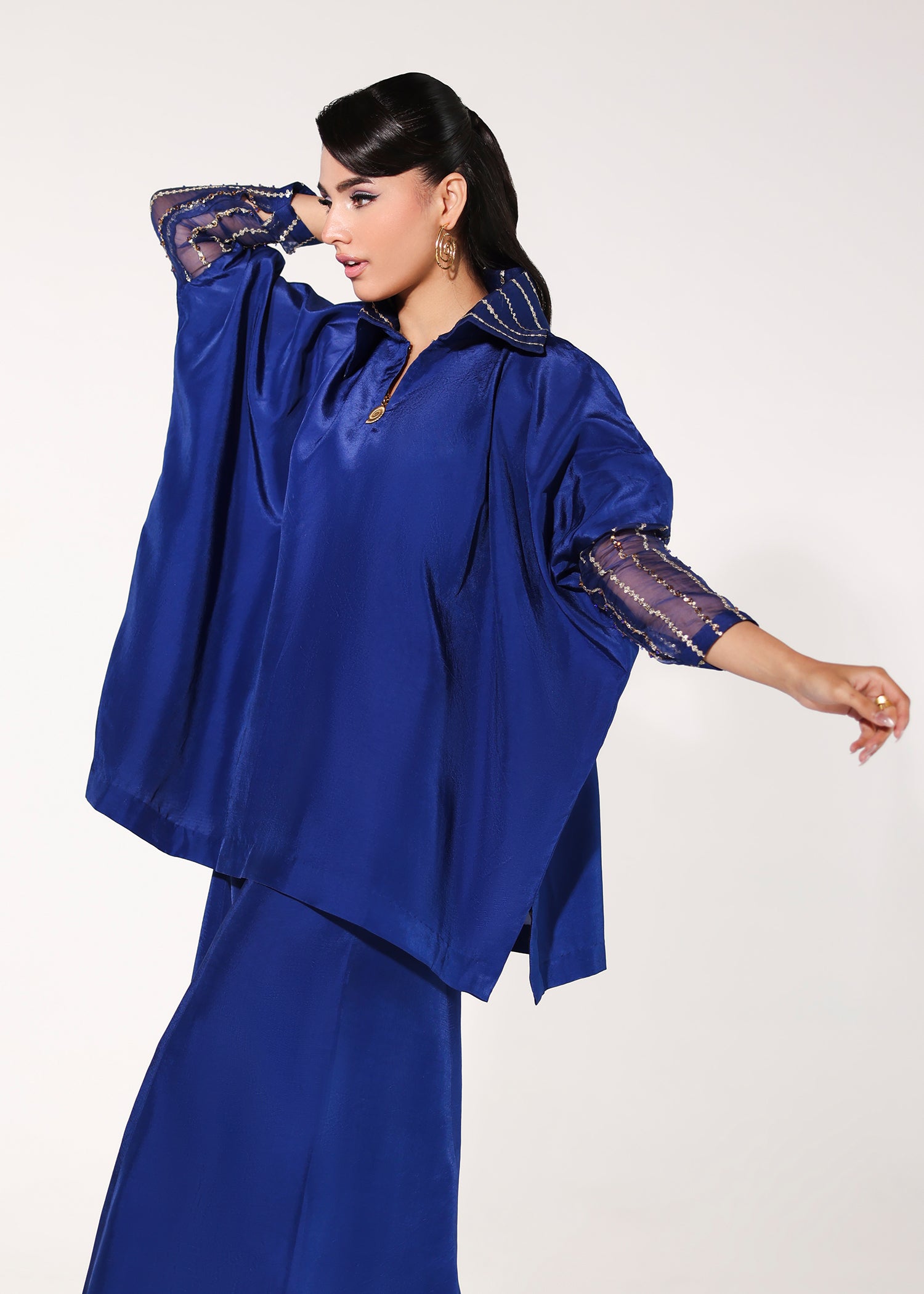 Crafted from premium Tussel silk, the Iris Outfit features a smooth texture and a beautifully fluid drape that reflects understated luxury. Designed with timeless elegance, the ensemble presents a sophisticated silhouette that transitions effortlessly from festive celebrations to formal gatherings and evening events.