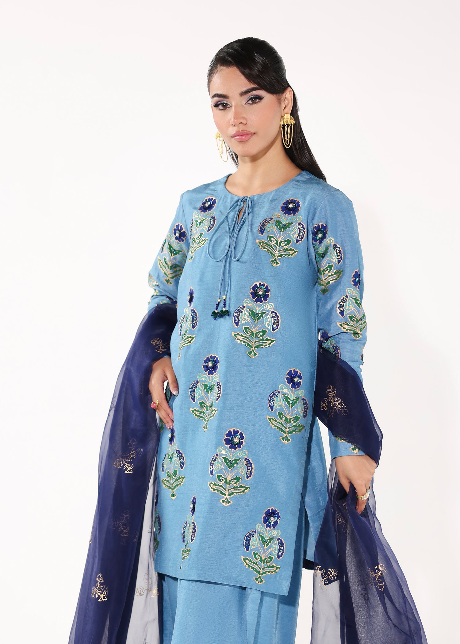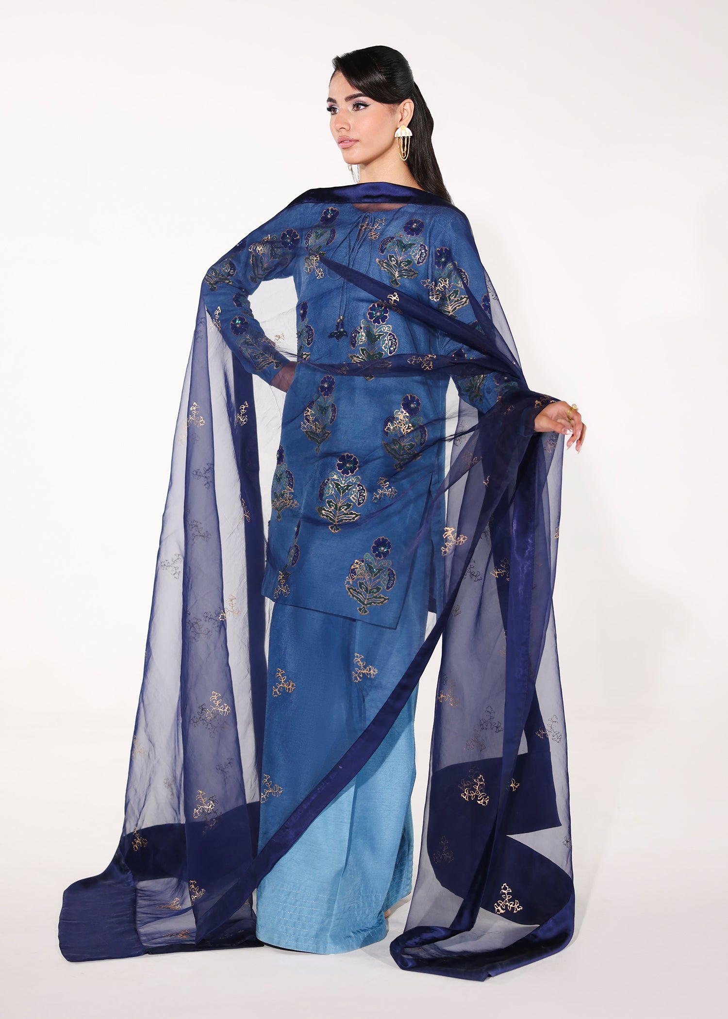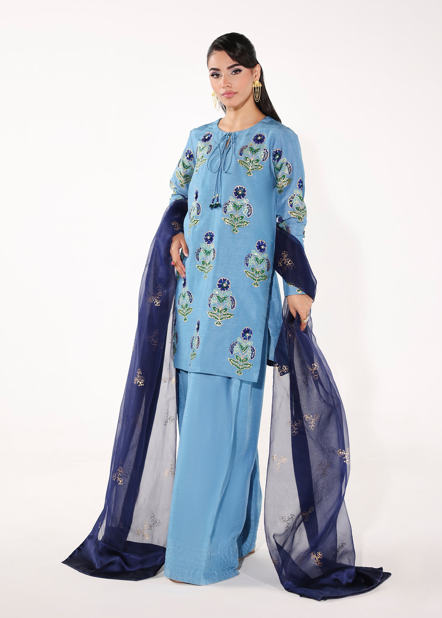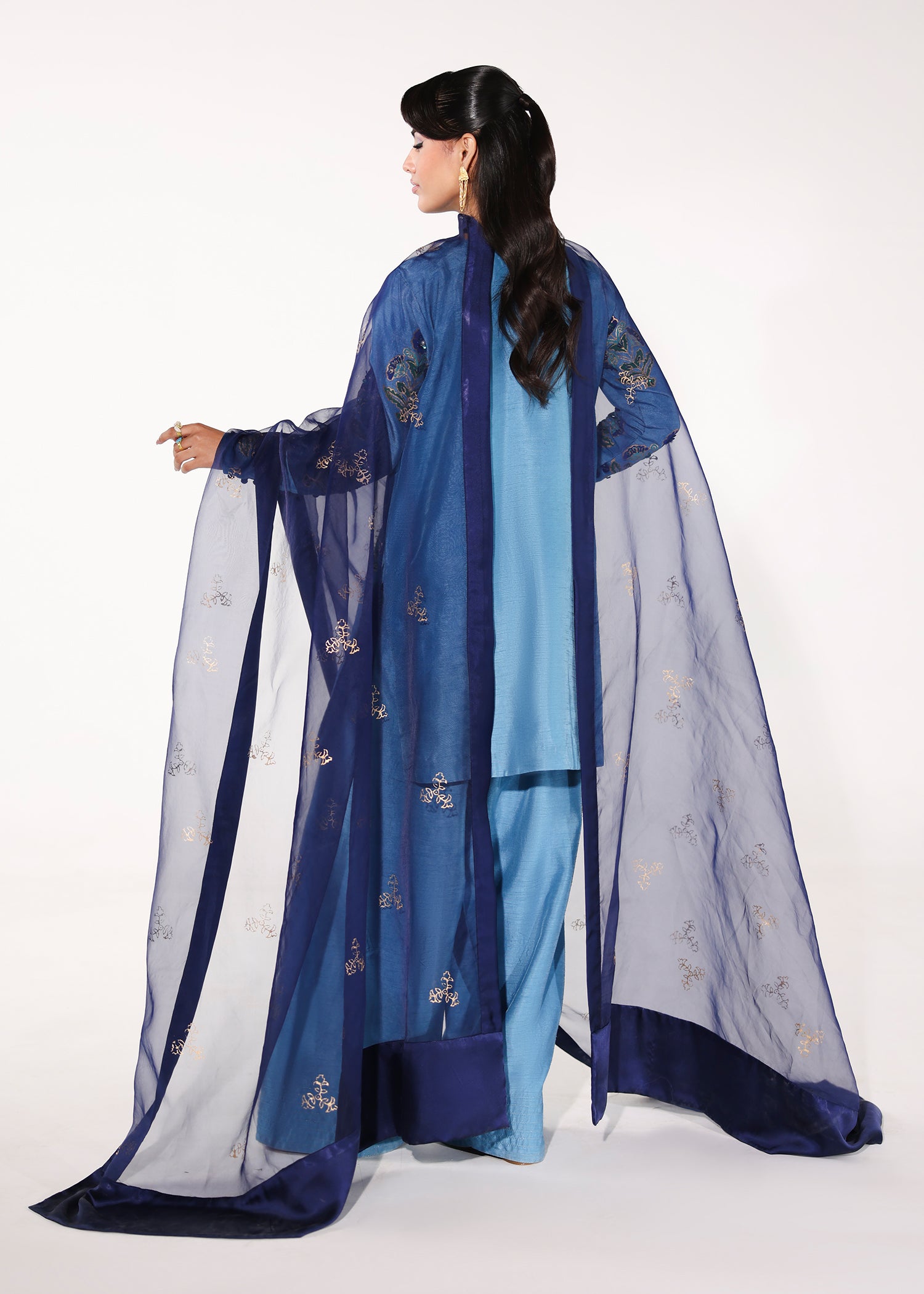 Crafted from premium Korean raw silk, the Nova Ensemble showcases a refined texture and elegant structure, exuding timeless sophistication. Paired with a sheer organza dupatta, the design achieves a perfect balance of modern charm and classic elegance.