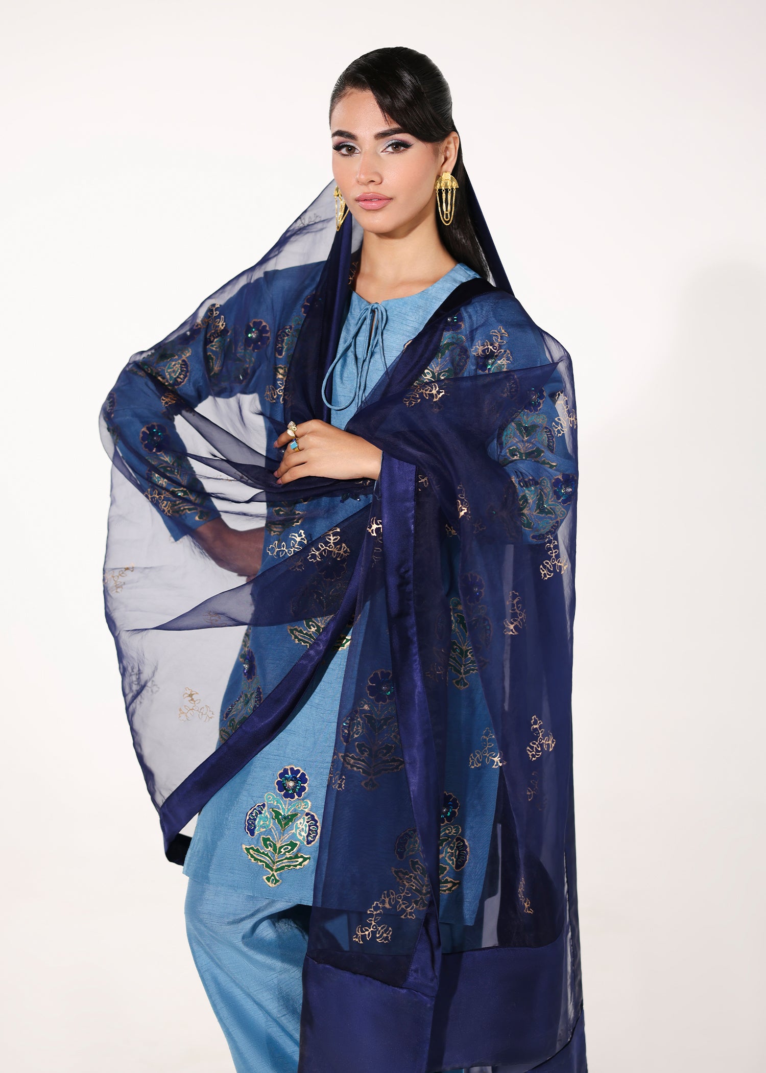 Intricate handworked embellishments featuring sequins and cutdana, complemented by detailed screen printing, add a subtle shimmer that elevates the ensemble’s overall appeal. Ideal for festive occasions and formal gatherings, Nova is a statement piece designed for effortless elegance.